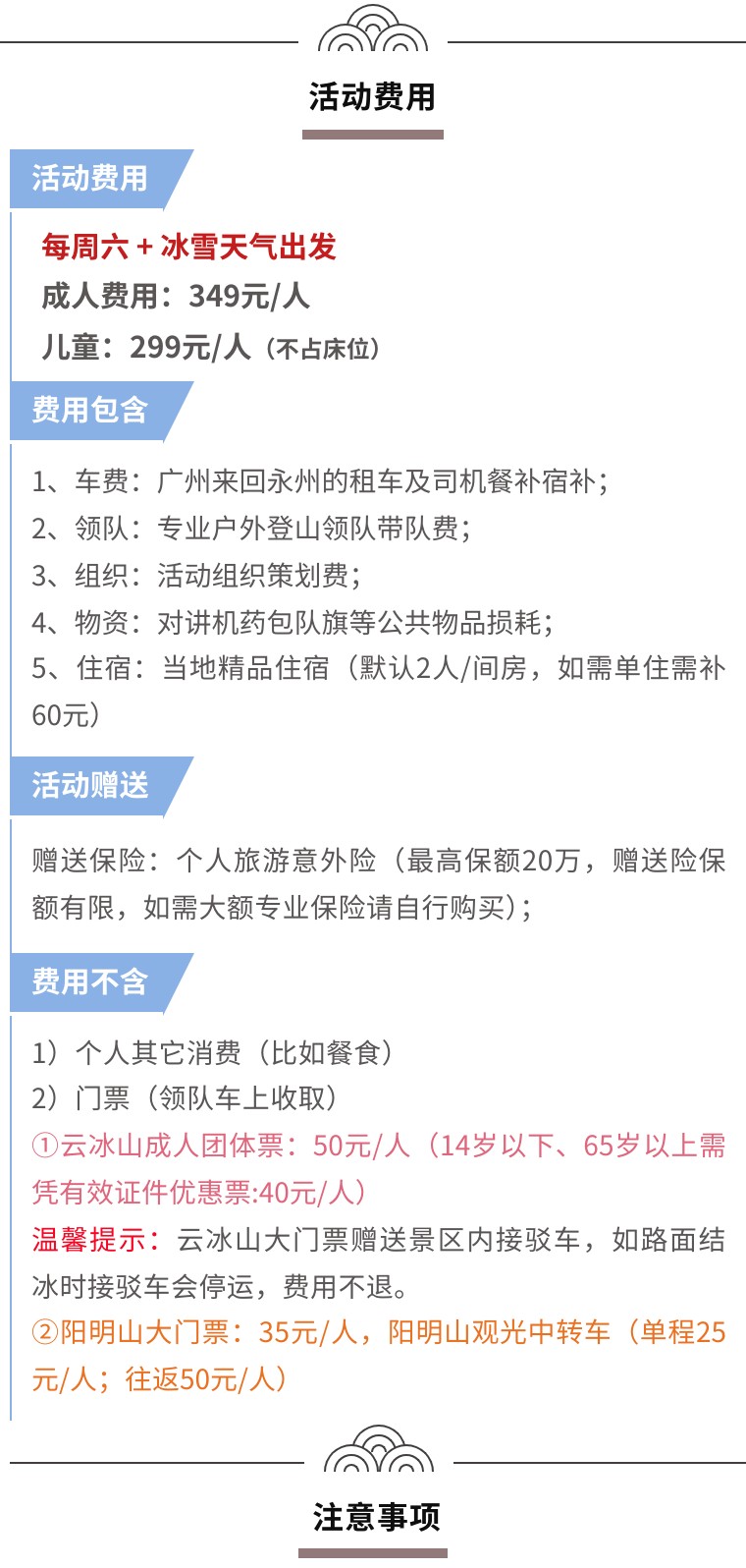 3、云冰山和阳明山的雪景、雾凇此为季节气候性产物特定条件下才能看到,不能保证百分百能看到,请以实际为准,如遇不理想,不另做赔偿。
