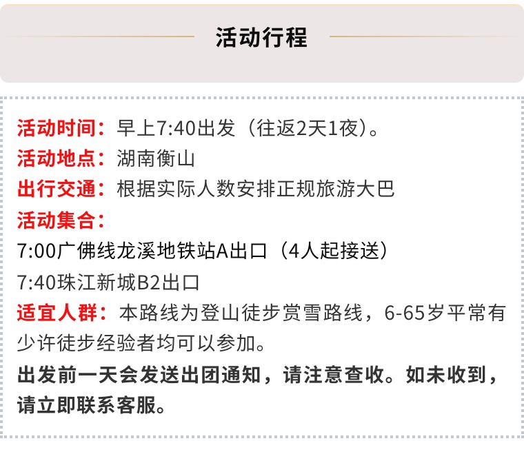 4. 如遇低温结冰导致高速临时封路等不可抗力因素,需变更交通方式或调整行程时间,产生的费用敬请自理(注意: 如遇广州到衡山高速出现道路结冰的情况,实行临时的交通管制;或衡山景区临时提前到中午时间闭园,会出现无法进入景区,行程会出现调整)。