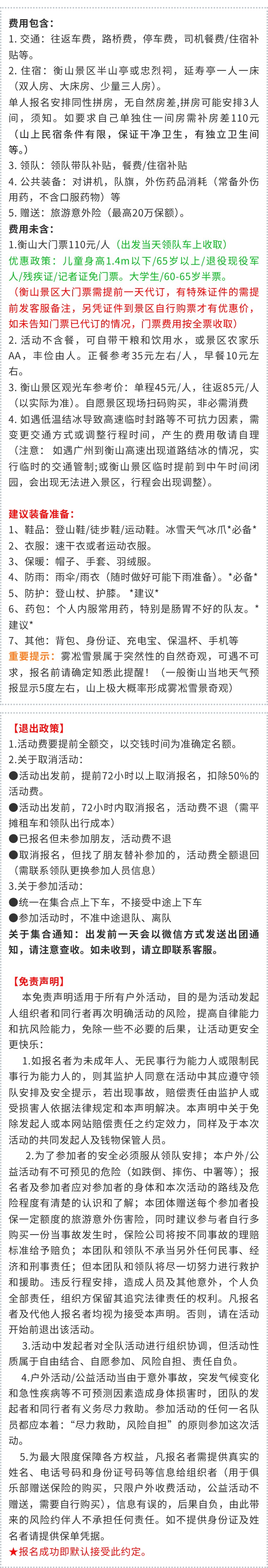 1.衡山大门票110元/人(出发当天领队车上收取)