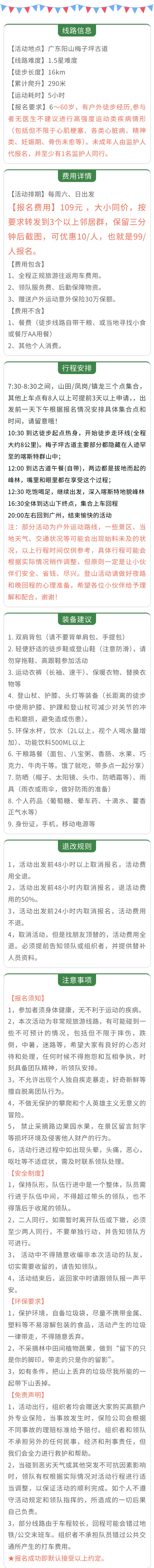 注:部分活动为户外运动路线,一些景区、当地天气、交通状况等可能会出现始料未及的状况,以上行程时间仅供参考,具体行程可能会根据实际情况稍作调整,但原则一定是让小伙伴们安全、省钱、尽兴。登山活动请做好夜路和晚回程的心理准备,希望各位小伙伴给予理解和配合,谢谢!