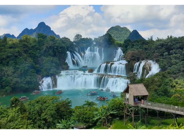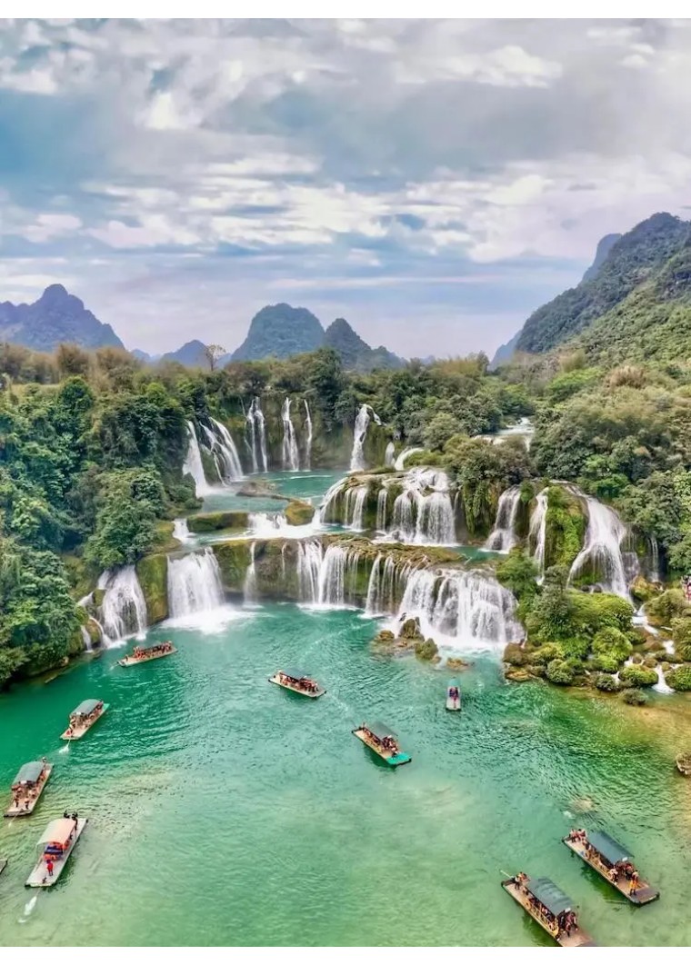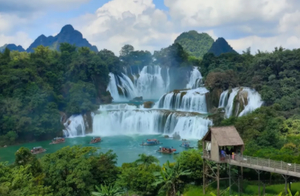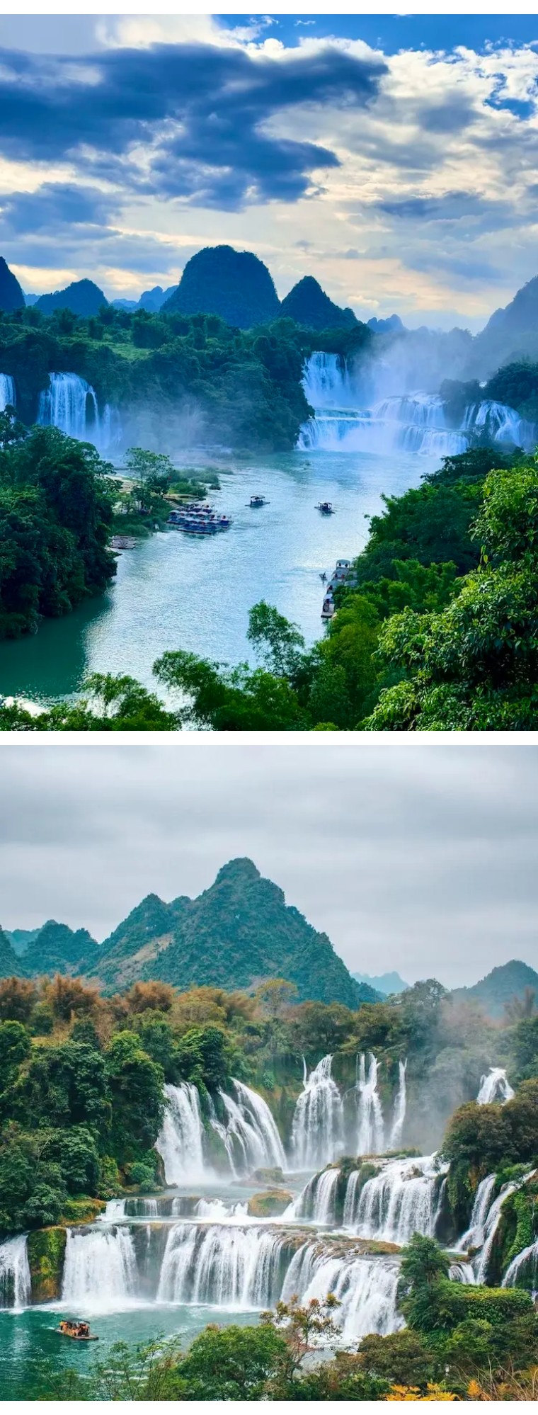 07:30 退房上车,前往【德天跨国瀑布】景区,1.5小时车程。约9点到达景区服务中心,购票后,转乘景交车进入景区,检票后即可近距离浏览著名的亚洲第一、世界第四的跨国大瀑布,瀑布横跨中、越两国,38道大小不一的急流从不同角度飞泻而下,呈三级跌落。景区内设有多个不同角度观景台,让你拍照不用愁。