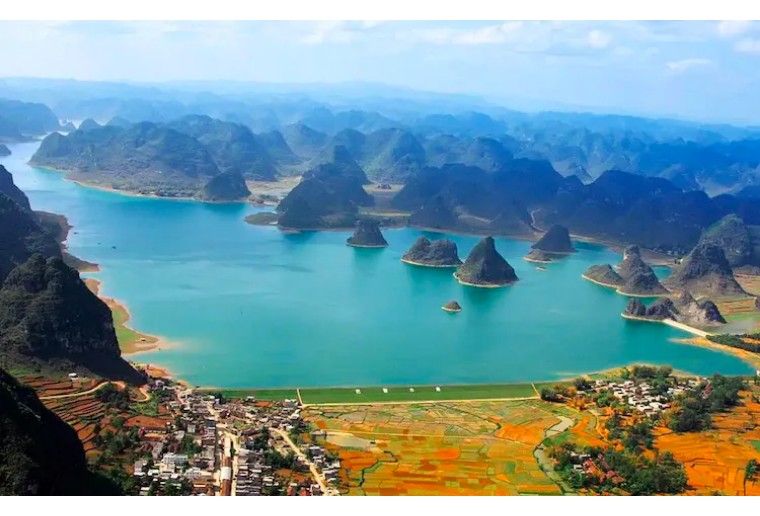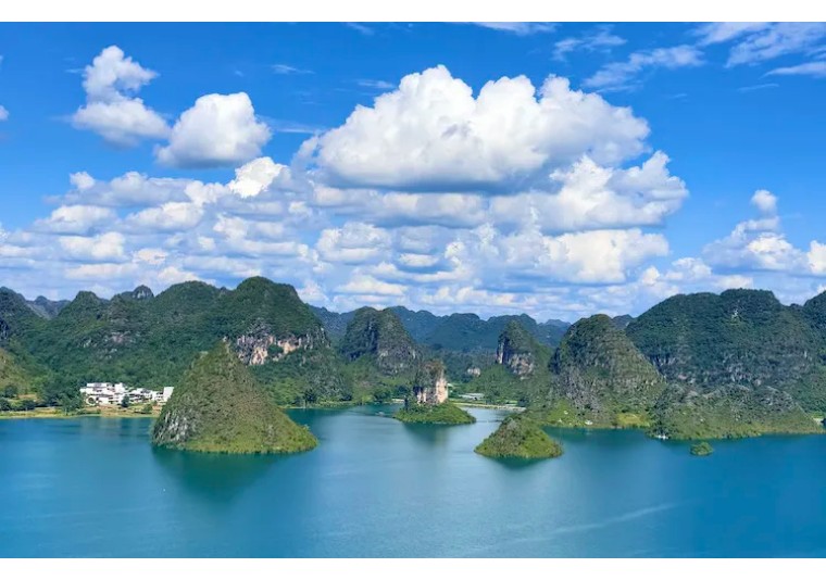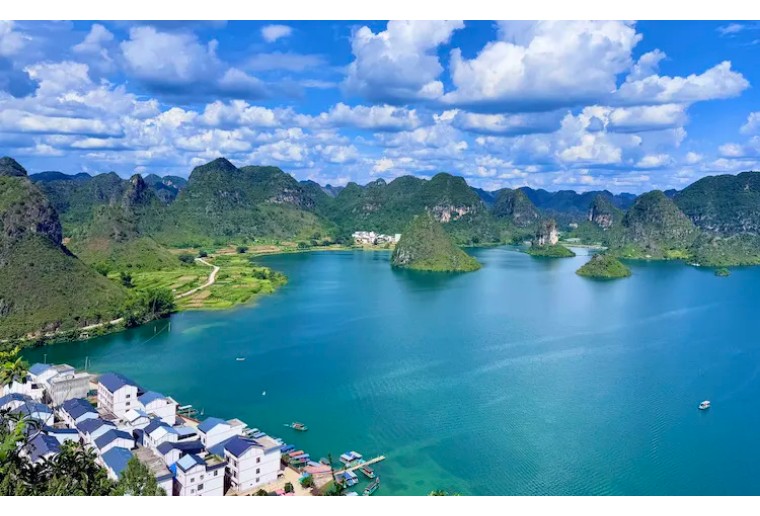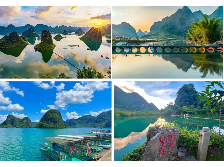 它被誉为"水上桂林"、"大里的海洋”。湖中有十多个大小岛屿,四周环绕着喀斯特峰林,沿岸点缀着几百个壮族干栏式村寨,湖面平静如镜,景色如画。