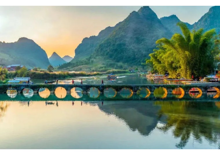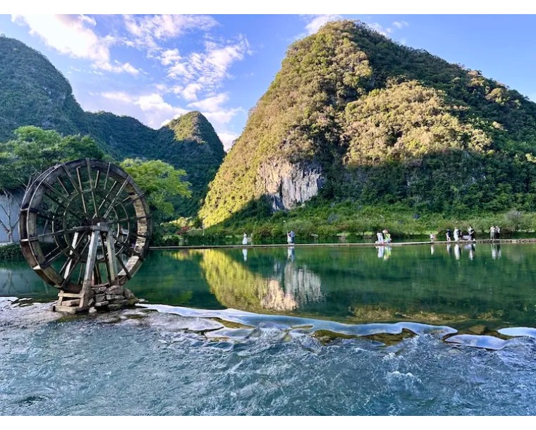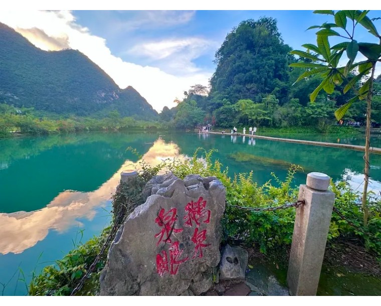 15:00 前往【鹅泉】风景区,1小时车程。这是中国西南部的三大名泉之一,也是德天瀑布的源头。地方虽不大,但各个角度都能拍出漂亮美景。可乘竹筏穿越古桥洞,近距离观察黑天鹅、白鹅与水生动植物。半山观景台可俯瞰泉池、稻田与喀斯特峰林全景。