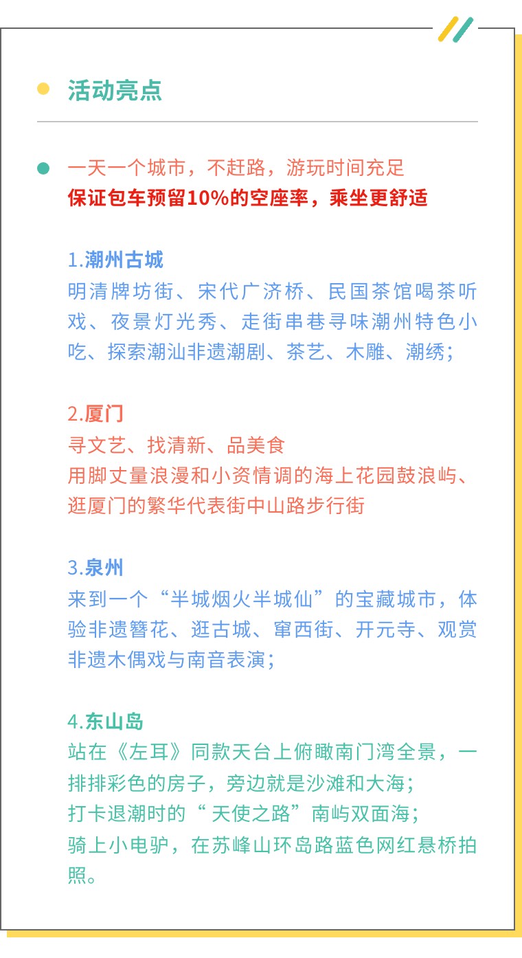 ②广济桥门票20元/人按需自理;东山岛租电动车或乘坐接驳车费用;泉州古城木偶戏(需游客自己在『泉州市木偶剧团』小程序提前预约买票。
