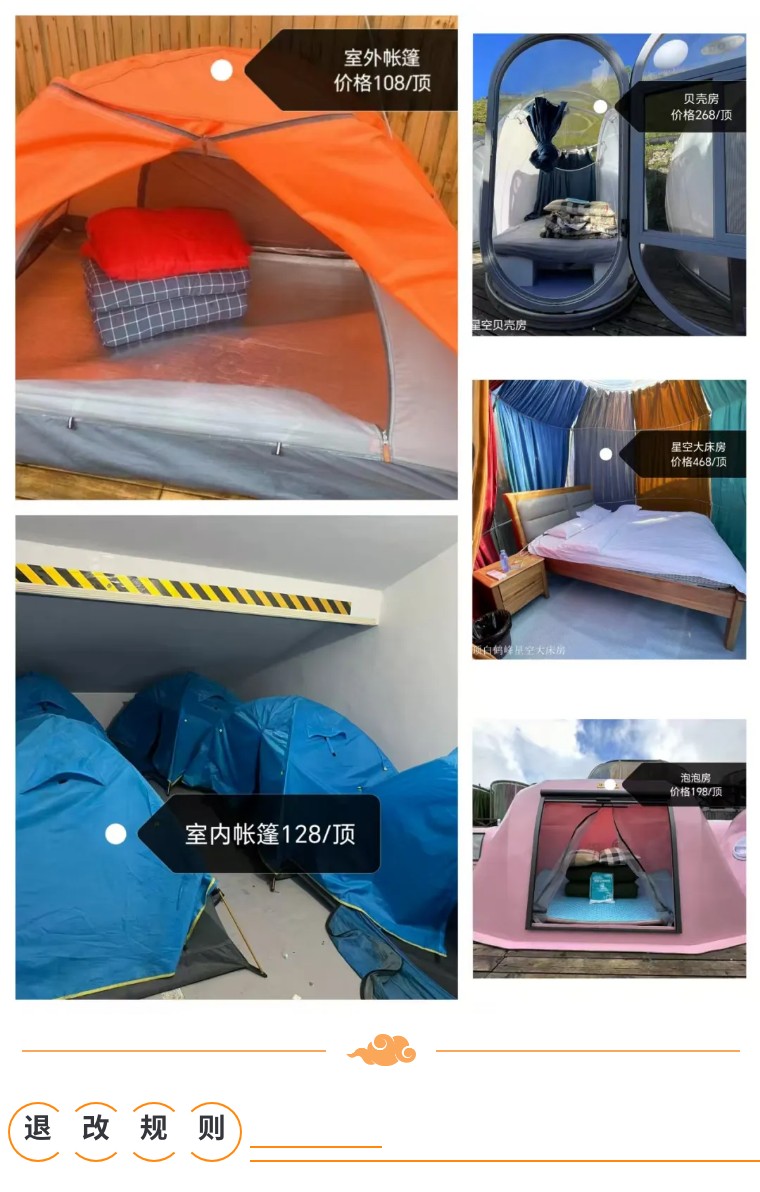 ③星空大床间468元/顶、贝壳房268元/顶、泡泡房198元/顶(可睡2个人,房间有限,请先咨询客服订位)