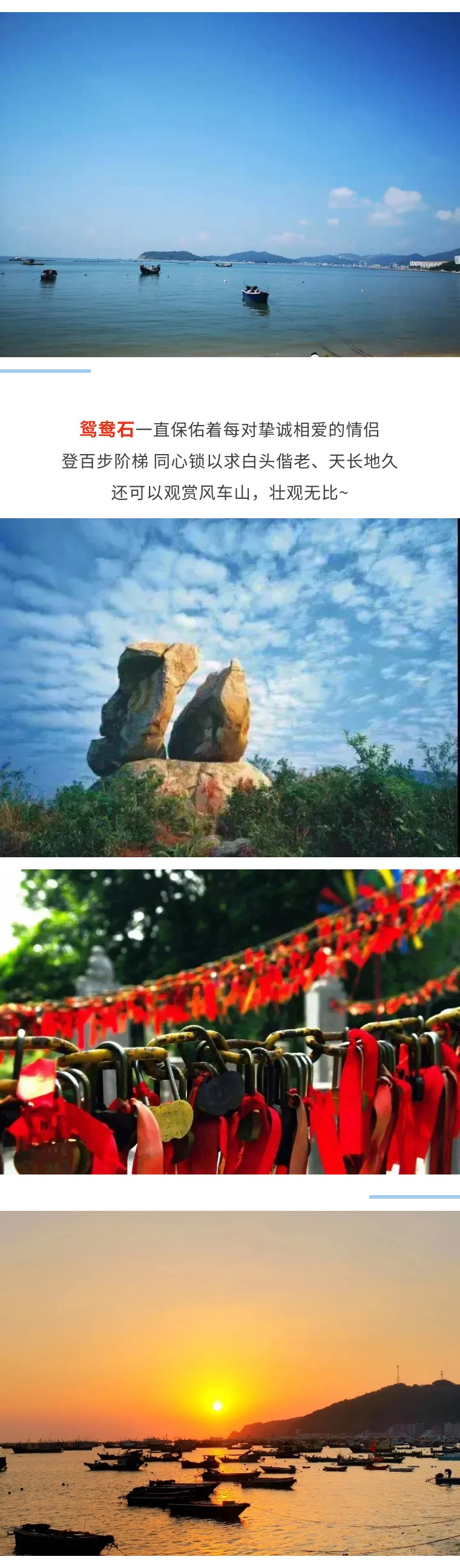 14:30 前往【东平飞龙寺】,被誉为“海上小故宫”,拍摄珍珠湾全景,观天涯海角,无敌海景;之后途径【鸳鸯石】,还可以欣赏远处的风车山,东平八景之一“鸳鸯石” 孔雀东南飞,自名为鸳鸯;鸳鸯飞何处,东平南平安! ”鸳鸯石一直保佑着每对挚诚相爱的情侣,登百步阶梯,以求白头偕老、天长地久;