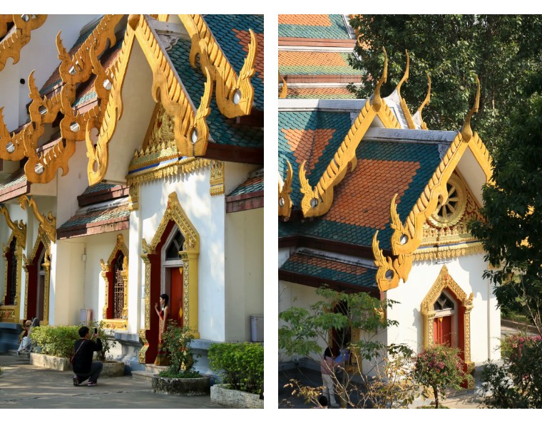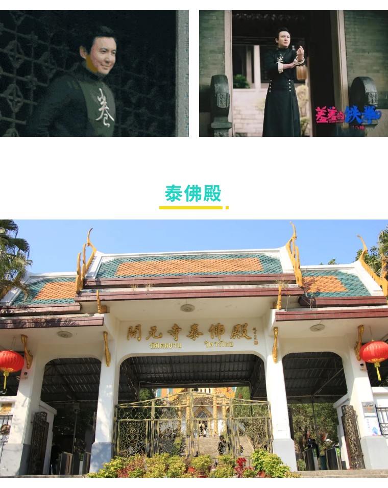 泰佛殿是中泰文化交流的典范,集中了泰国古代雄奇、精巧的建筑风格。重檐多面式屋顶装鱼鳞瓦、封檐板装向上的黄色图形,柱头、山墙、窗户等等巧思设计,无不让人惊叹。