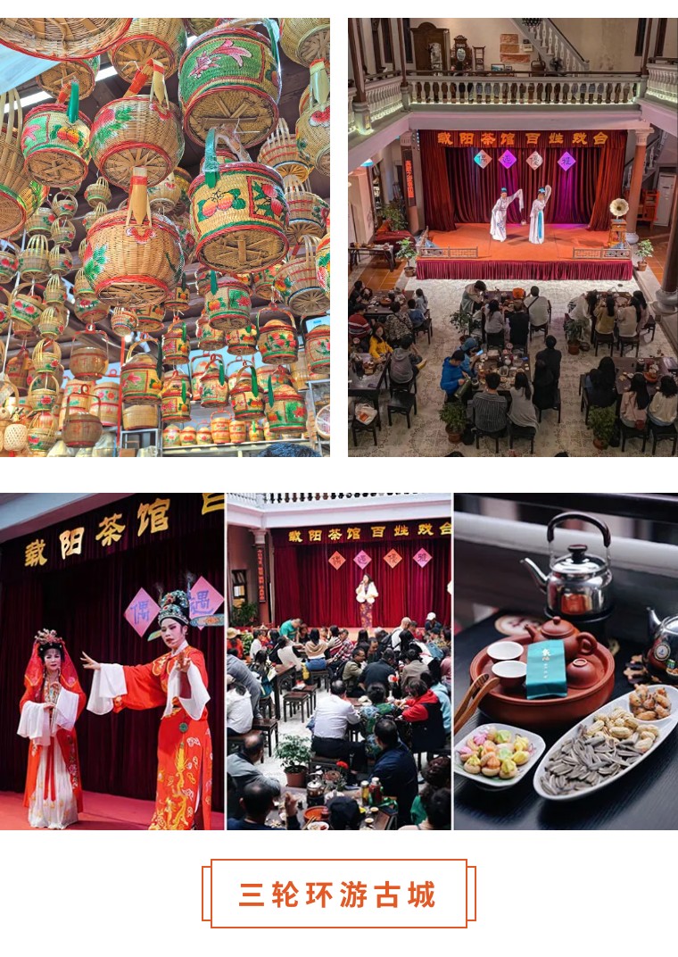 坐在茶馆内喝茶聊天、观赏潮剧、听潮人讲古是一种无比美妙的体验,宛如时光倒流,回到旧时潮州,感受她昔日的繁华。有潮剧、潮州弦诗乐、琵琶、古筝、民国风情歌等。